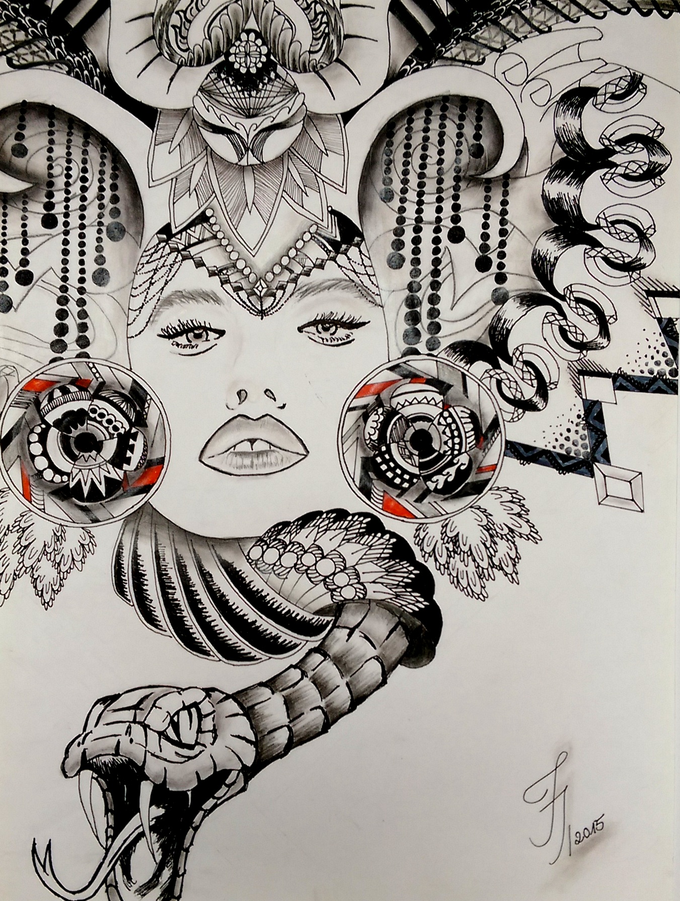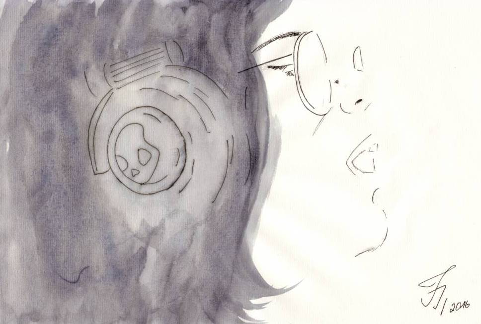 Material: Fineliner, Bleistift, schwarzer Buntstift, Filzstift, Lidschatten, Aquarell